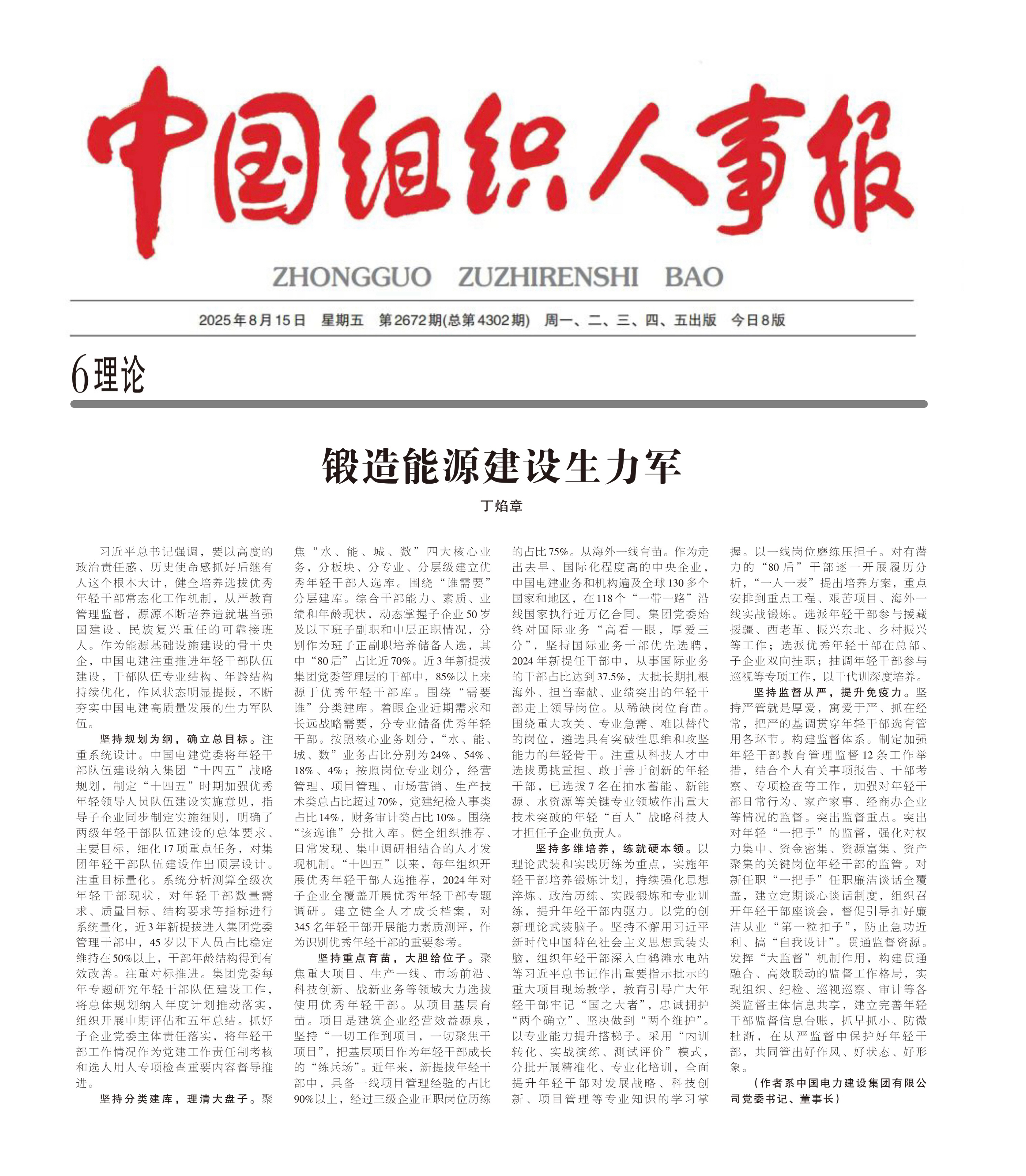 公司黨委主要負(fù)責(zé)同志在《中國組織人事報》刊發(fā)署名文章:鍛造能源建設(shè)生力軍