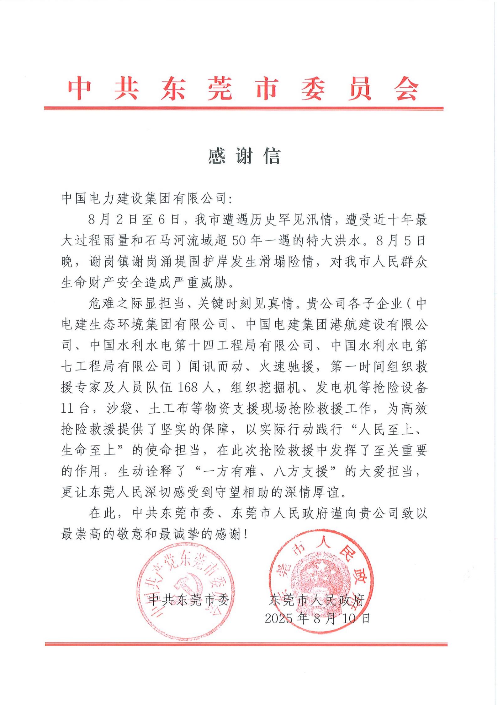 近日,公司收到中共東莞市委、東莞市人民政府發來的感謝信。信中高度贊揚了在東莞謝崗鎮遭遇近十年最強暴雨與超50年一遇特大洪水侵襲的危急關頭,電建生態公司聯合電建成員企業火速馳援、守護地方安瀾的央企擔當。 8月2日至6日,東莞市遭遇歷史罕見汛情,石馬河流域遭受超50年一遇特大洪水。8月5日晚,謝崗鎮謝崗涌堤圍護岸在洶涌洪水沖擊下突發滑塌險情,人民生命財產安全懸于一線。 災情就是命令。作為中國電建在粵子企業,電建生態公司東莞石馬河項目第一時間聯合電建港航公司、水電十四局、水電七局在莞單位,組建由技術專家、搶險骨干組成的168人突擊隊,調配挖掘機、發電機等重型設備11臺,攜沙袋、土工布等大批應急物資星夜奔赴謝崗搶險核心區馳援。 暴雨如注,水流湍急,滑塌現場險象環生。電建搶險團隊抵達后,根據現場實際情況,憑借豐富的水利應急經驗,科學研判、高效協同,細化任務清單,統籌調配資源,迅速制定護岸加固方案,采取人機協同作業模式與洪魔展開了驚心動魄的鏖戰。經過22小時晝夜連續奮戰,堤壩缺口終于成功合龍,搶險隊員們齊心協力,用血肉之軀筑起了守護群眾安全的鋼鐵長城。 在此次救災工作中,公司搶險救援隊始終沖鋒在前、勇挑重擔,在洪災考驗面前展現出了硬核作風,為打贏防汛救災攻堅戰注入了力量,以實際行動踐行了央企擔當。 |