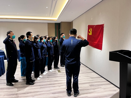 4月15日上午,中電建援滬醫療隊臨時黨支部召開第一次會議,臨時黨支部書記杜睿帶領全體黨員和預備黨員重溫入黨誓詞。大家表示,面對黨旗,感到由衷的神圣和莊嚴,也更讓自己決心把疫情防控作為使命和責任,誓與疫情戰斗到底,以實際行動踐行入黨初心,筑牢保護人民群眾生命安全的鋼鐵長城。